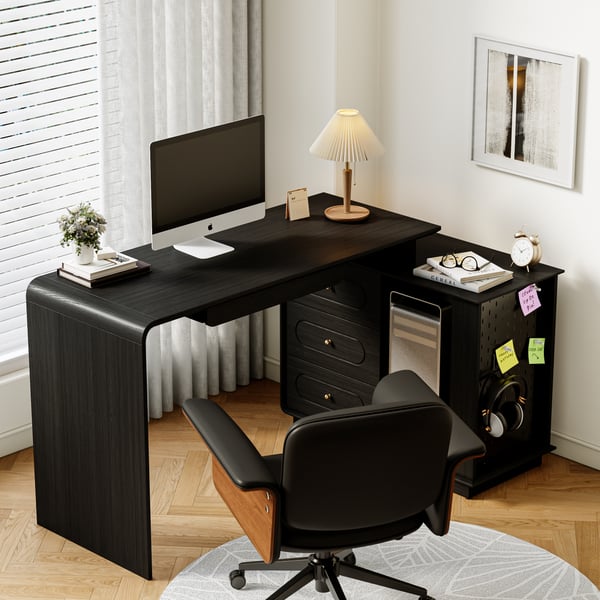Modern 73" L-Shaped Black Rotating Desk with Keyboard Tray & Storage