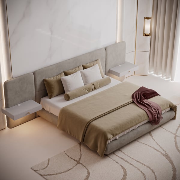 King Size Upholstered Bed with Extended Headboard & Smart Leather Nightstand Set