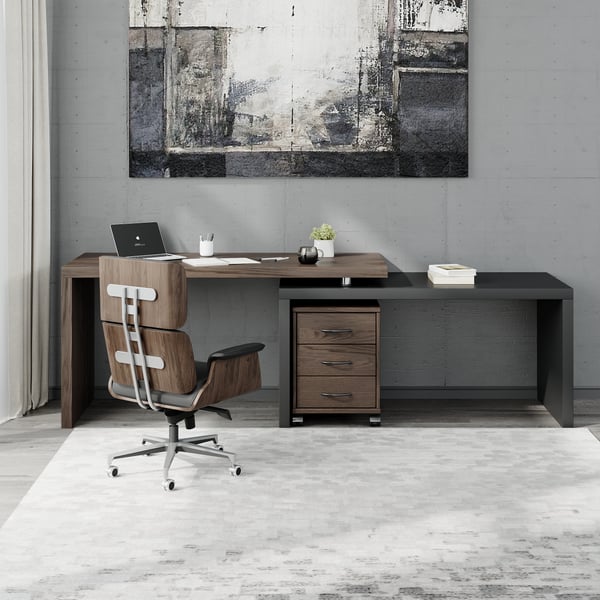 Modern Set L-Shaped Desk in Walnut & Reclining Leather Office Adjustable Swivel Chair