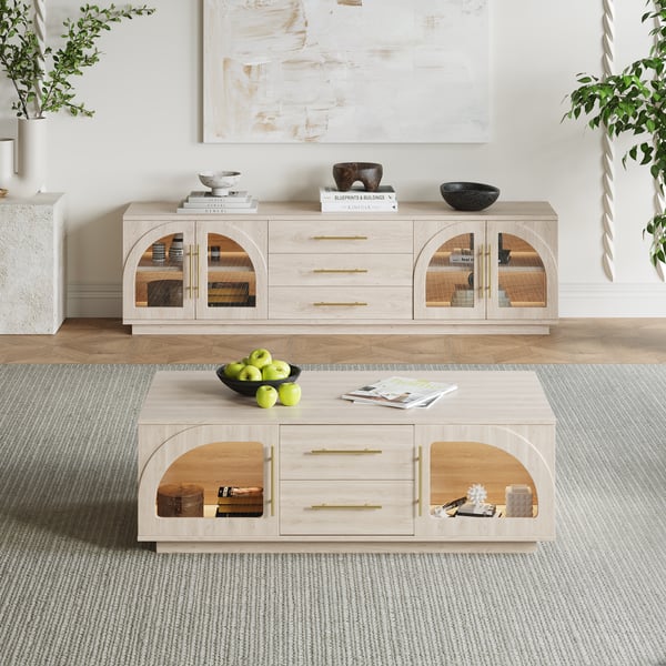 Arune 72" Arched Glass Doors TV Stand Coffee Table Set with Storage and LED